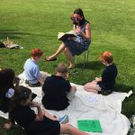 This past week was the final library class for the second graders and, once again, Mrs. Nieze did not hesitate to make things especially special. Laying out picnic blankets, bringing a cordless microphone, and goofy props, she allowed each child to share a piece of their own writing that they recently composed.